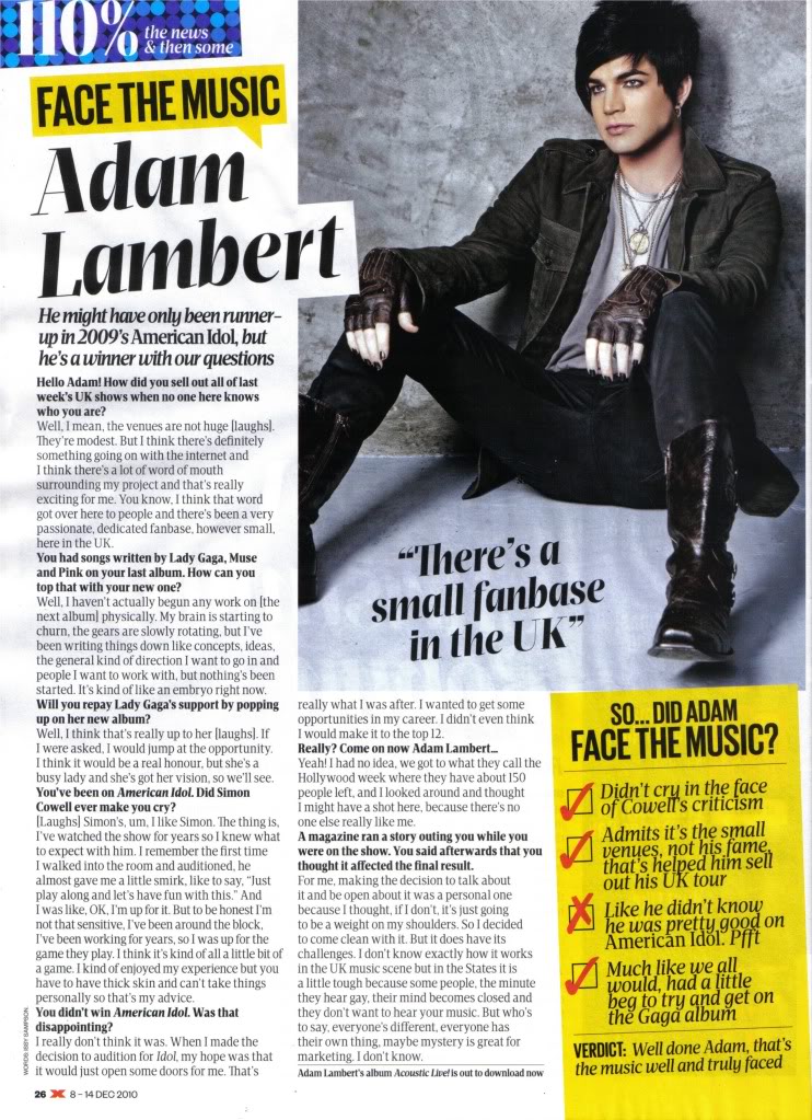 Here’s a round-up of Adam media that collected since the last time I posted: Adam Lambert’s short interview with Kerry-Anne (Australia) (yFrog Video); Voice of Holland interview (Part 1, Part 2, Pic); Adam names his best album/singer for 2010 via Idolator; VH1 Posted new video with Adam; Goom Radio interview (MP3 DL); Vienna interview with Art Magazine; Check out scans of Adam’s calendar via this twitpic account; X-Factor magazine interview with Adam (Scan); Purefan French TV interview (Video & YouTube); And some gossip that Adam supposedly spent his Paris vacation with Sauli Koskinen (the same guy he was rumored to have a fling with during GNT); Adam interview with Daily Mouloud (France) (Video); Adam interview with Ozap (translation by a fan).