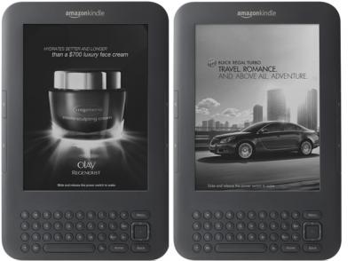Awkward convo scenaro: “Hey, is that an Olay ad in my Kindle?” “Yeah… I got you the new Kindle that has ads on it… [they’re a little cheaper than the regular kind…]” “Hey, hey, hey, now I’ve got a Buick in my Kindle!” “… If you really hate the ads though, you can get rid of them … [for like $30 extra …]”