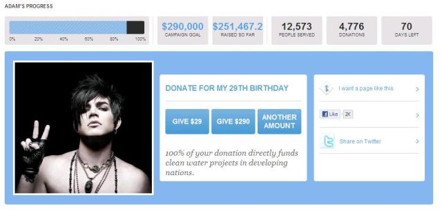 Take a look at how much Adam Lambert’s fans have raised so far for Charity Water! $251K raised so far, and counting! Makes me feel all warm and fuzzy 🙂