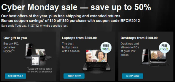 * If you were in the market for a new PC or laptop anyway, why not check out the HP sale since you get a FREE Nook out of it? Plus Bonus coupon savings of $10 off $50 purchase with coupon code BFCM2012!